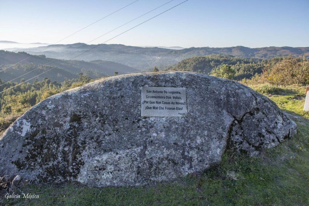 Sobre una roca de las proximidades veremos una placa con la siguiente inscripción: “San Antonio da Regueira, casamenteiro das vellas, ¿Por qué non casas as novas?, ¡Qué mal che fixeron elas!”