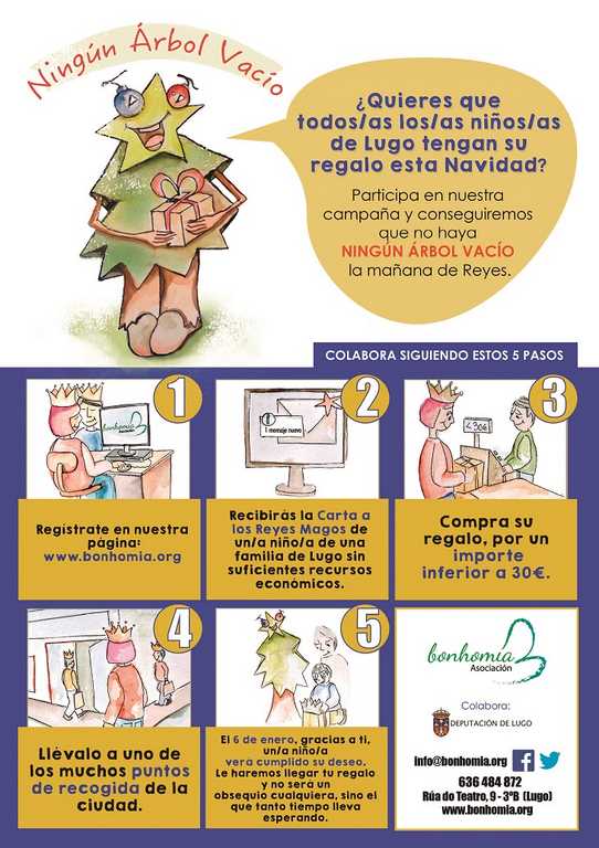 Bonhomía es una asociación sin ánimo de lucro con sede en Lugo, dedicada a la realización de proyectos de sensibilización sobre diferentes desigualdades: económicas, culturales, de género… Esta es la 2ª edición del proyecto «Ningún árbol vacío». Las ONGs y asociaciones de Lugo (Aspace, Down, Cogami, Secretariado Gitano, Aliad Ultreia…) hacen una selección de familias con dificultades para comprar a los niños/as un regalo esta Navidad. Los/as menores escriben la carta a los Reyes. Bonhomía se encarga de recoger esas cartas y mandárselas a compradores/as que, mediante su inscripción en la web www.bonhomia.org, colaboran en el proyecto. Los regalos se devuelven a las Asociaciones y ONGs para que sean ellas las que den los regalos a las familias, evitando así una doble situación de vulnerabilidad al no ser Bonhomía quien lo hace. El año pasado llegamos a cientos de menores y este año estamos en ello, pero aún necesitamos más reyes magos que se animen a participar!