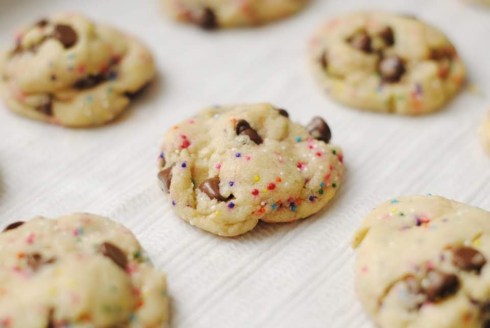 390 g de harina, 2 1/2 cucharaditas de levadura química, 1/4 cucharadita de bicarbonato sódico, 1/2 cucharadita de sal, 75 g de mantequilla (a temperatura ambiente), 4 cucharadas de aceite de girasol, 265 g de azúcar, 2 huevos, 1 1/2 cucharaditas de extracto de vainilla, 175 ml de leche, 125 g de nata líquida para montar, 1 cucharada de zumo de limón, 150 g de chips de chocolate.